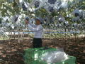 ぶどうの「こう」(ふさの表面に付いた白い花粉)を落とさない様に、慎重に作業します